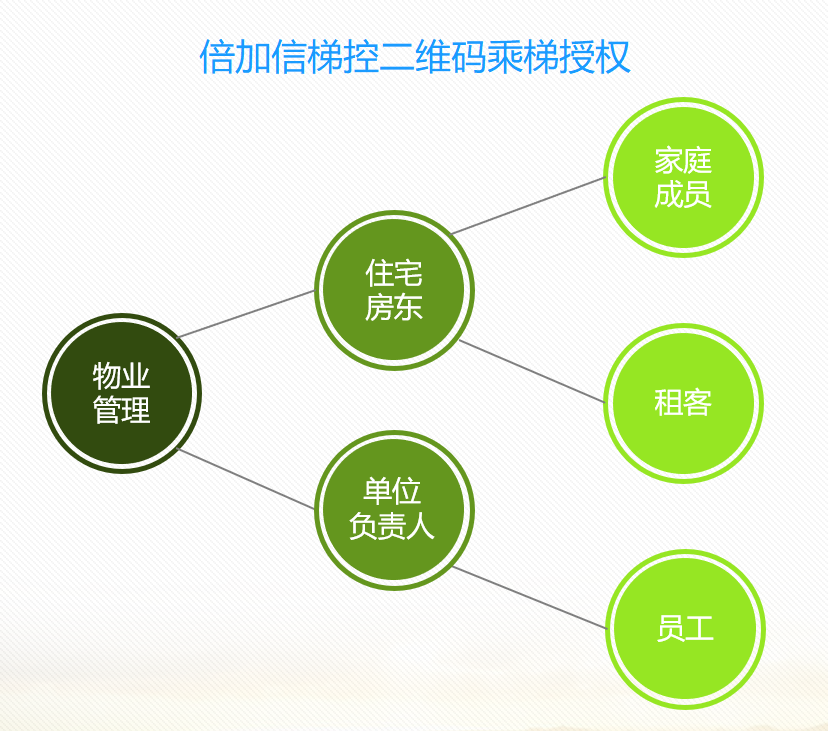 第三方應用:我司二維碼梯控系統可與第三方應用對接,比如住宅、寫字樓、醫院等已經有自己的小程序、公眾號或者地產APP、園區APP等,我司提供梯控系統二維碼生成規則,第三方應用可在現有應用中直接生成乘梯二維碼,避免讓業主/員工用多個手機應用。 二維碼乘梯授權方式