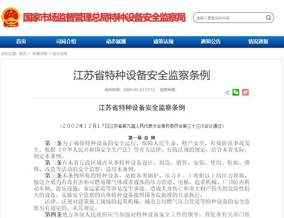 《江蘇省特種設備安全監察條例》2002年12月17日江蘇省第九屆人民代表大會常務委員會第三十三次會議通過